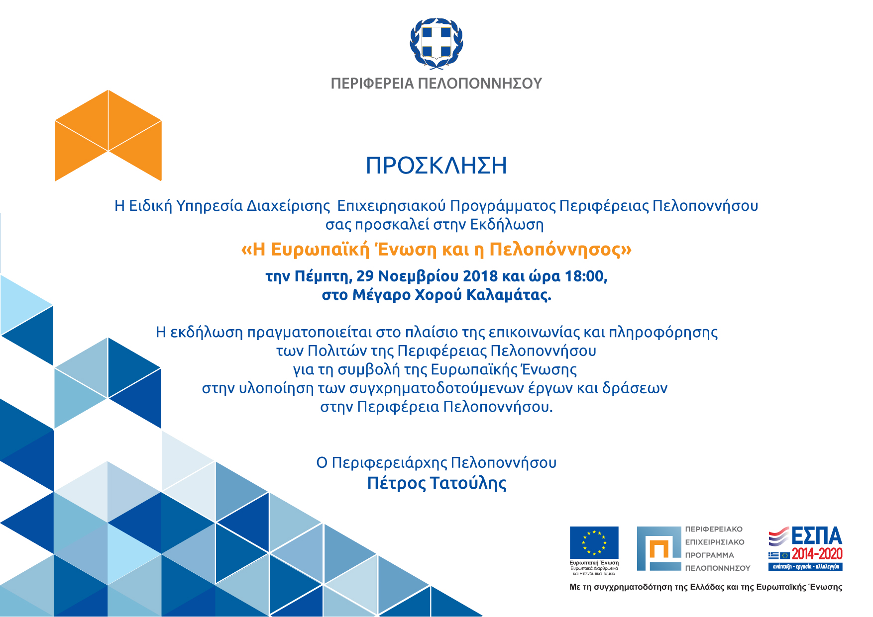 Σας προσκαλούμε στην εκδήλωση «Η Ευρωπαϊκή Ένωση και η Πελοπόννησος» την Πέμπτη 29 Νοεμβρίου 2018 στις 18:00 μ.μ. στο «Μέγαρο Χορού Καλαμάτας».