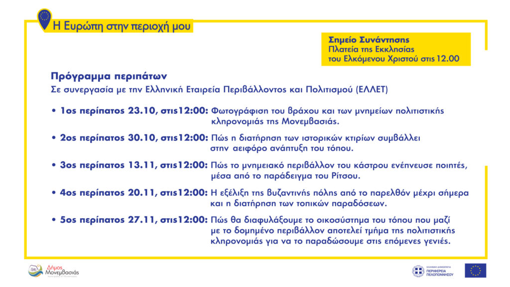 Στο πλαίσιο της καμπάνιας «Η Ευρώπη στην περιοχή μου» που θα διαρκέσει από τις 21 Οκτωβρίου έως τις 27 Νοεμβρίου στην Μονεμβασιά, με κεντρικό θέμα «Το πέτρινο καράβι που ταξιδεύει στο χρόνο» το οποίο είναι εμπνευσμένο από τους στίχους του ποιητή Γιάννη Ρίτσου, θα οργανωθούν 5 περίπατοι, σε συνεργασία με την Ελληνική Εταιρεία Περιβάλλοντος και Πολιτισμού- ΕΛΛΕΤ.